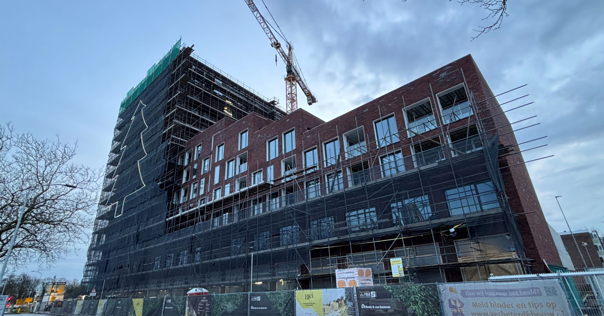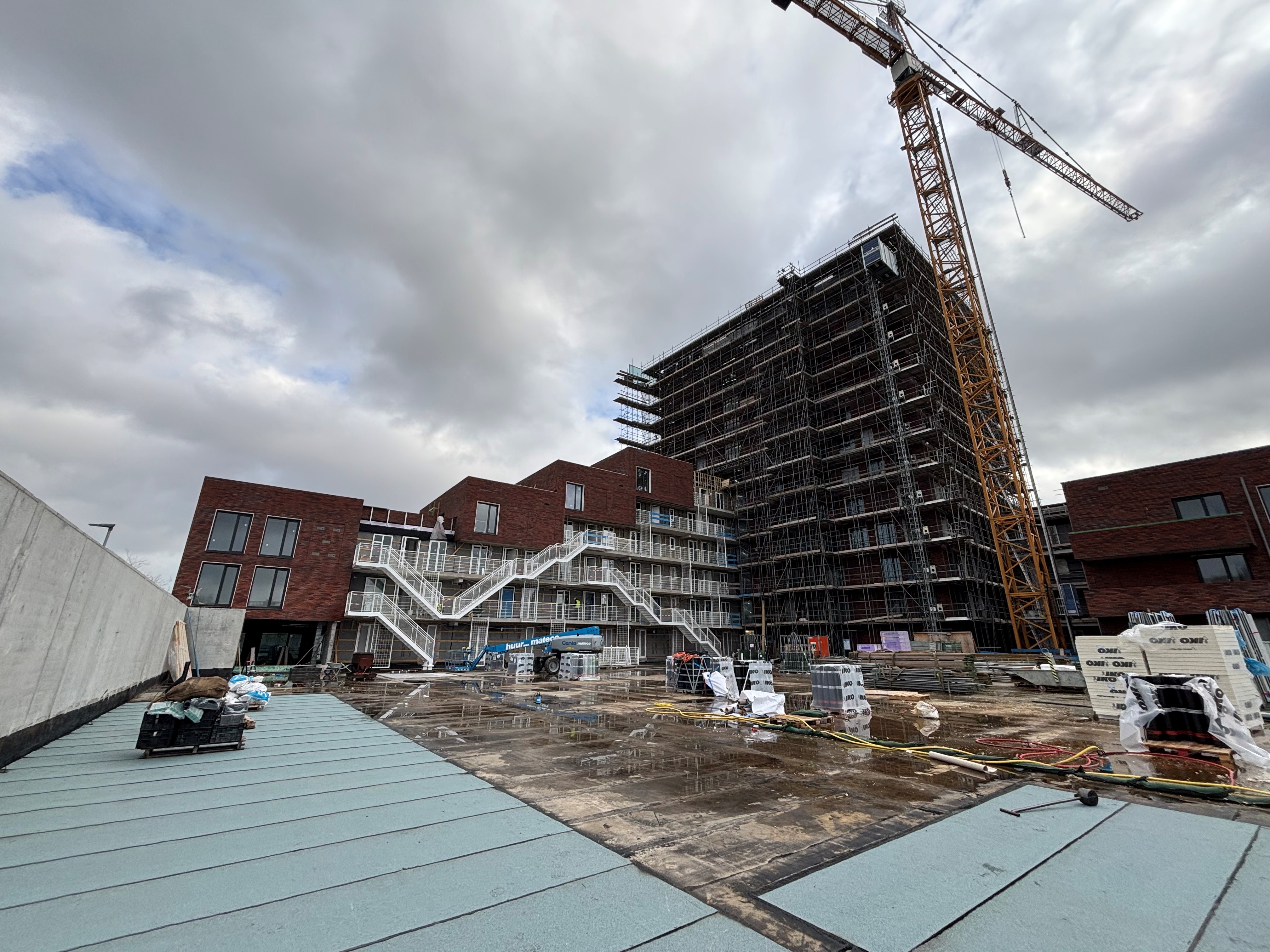Hoog boven Leiden en omgeving schittert een grote lichtgevende kerstboom op de toren van het gebouw, een baken van licht dat de voortgang van het project markeert. Terwijl de kerstvakantie nadert, wordt er op de bovenste verdieping nog volop gemetseld. De eerste torenkraan is inmiddels gedemonteerd en stukje bij beetje wordt het gebouw uitgepakt. Langs de Jacob van Campenlaan en het eerste deel van de Rooseveltstraat verdwijnen de steigers, waardoor de rode gevel met zijn witte kaders steeds beter zichtbaar wordt.